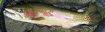 50cmを軽く超えたニジマスはゴツイ顔つきだが、尾びれはピンとしていてなかなか美しい魚だった。口先に点のように